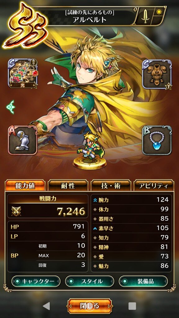 Source: img.gamewith.jp アルベルトは、「 勇健強撃ⅳ 」でhp満タン時に与ダメが +20% 上昇するアタッカースタイルです。 ロマサガrs攻略まとめ速報 2020/04/25(土) 09:53:32.05 うちの知力140弱のアルベルトだと陣形補正50のとこに置いても224や225だと気絶成功率が50あるかないかで使いにくすぎる 89: 技 ・ハヤブサ斬り【威力c bp4】 覚醒させればbp3でありながら 威力c間接のファスト攻撃 と非常に優秀な技です。. 【ロマサガ】【相談】アルベルトの知力装備込みいくつあったらuh4確殺取れる? | ロマサガrs攻略まとめ隊 ロマサガrs攻略まとめ隊では『ロマンシング サガ リ・ユニバース』の2chで話題の攻略&まとめネタ記事を中心にロマサガrsのイベント攻略速報情報. 体力は被ダメージを減らすのに関係する能力です。ssアルベルトは体力が上昇しやすいです。 スタイル補正も体力が一番高いです。補正率は レベル50で、71.00%+17 になります。 仮に基礎体力が50の状態だと、最終的な体力は102。